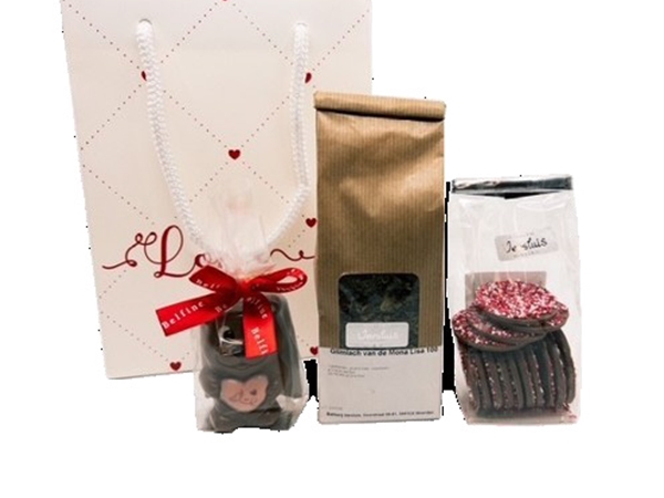 Tasje gevuld met 150 gram musketoublies, 100 gram thee /glimlach van de Mona Lisa en een chocoladebeertje